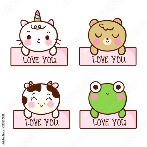 Set Of Cute Animals Labels Cartoon Kawaii Unicorn Cat Vector Cow